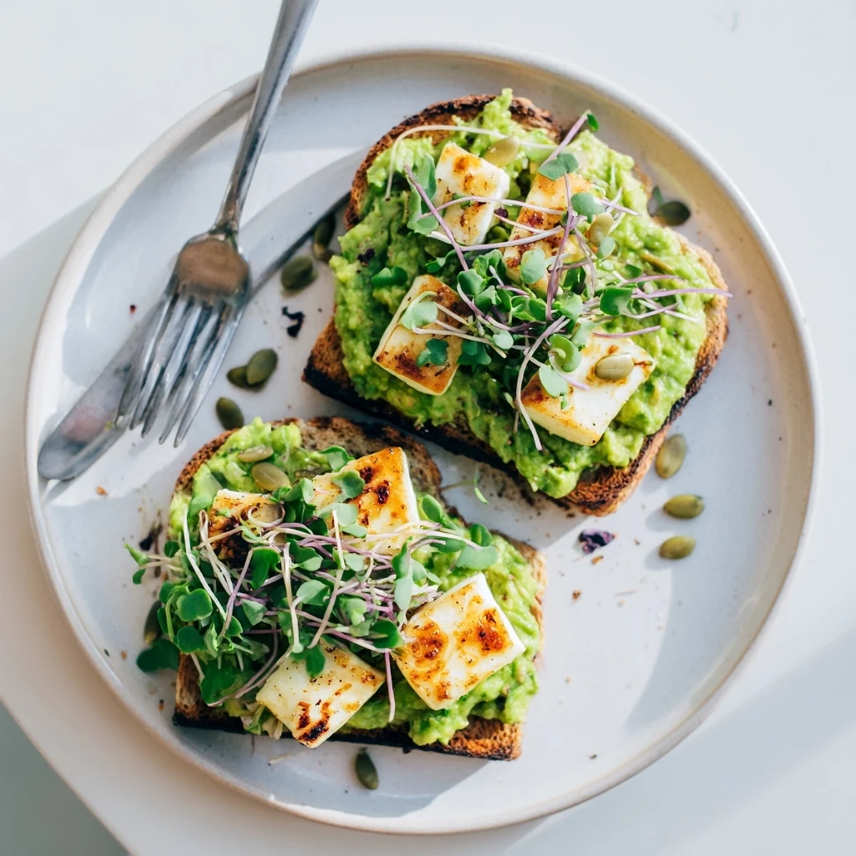 Ready in about 20 minutes, this bright toast starts with 1 cm halloumi slices pan-fried until golden and crispy. Mash ripe avocado with lemon juice, salt, pepper and optional chili flakes; toast rustic sourdough and spread the avocado thickly. Top with warm halloumi, drizzle extra virgin olive oil, and finish with microgreens and toasted seeds. Serve immediately; swap herbs, tomatoes or gluten-free bread as needed.