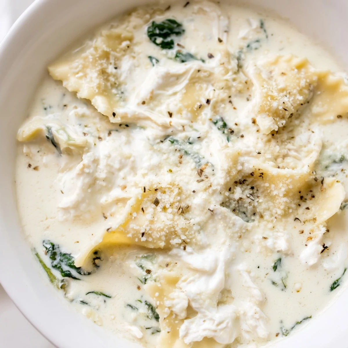 This comforting white lasagna soup transforms all the flavors of classic baked lasagna into a quick one-pot meal. Tender broken noodles swim in a creamy broth base enriched with whole milk and heavy cream, while shredded chicken adds protein. The trio of ricotta, mozzarella, and Parmesan creates that signature cheesy lasagna experience.