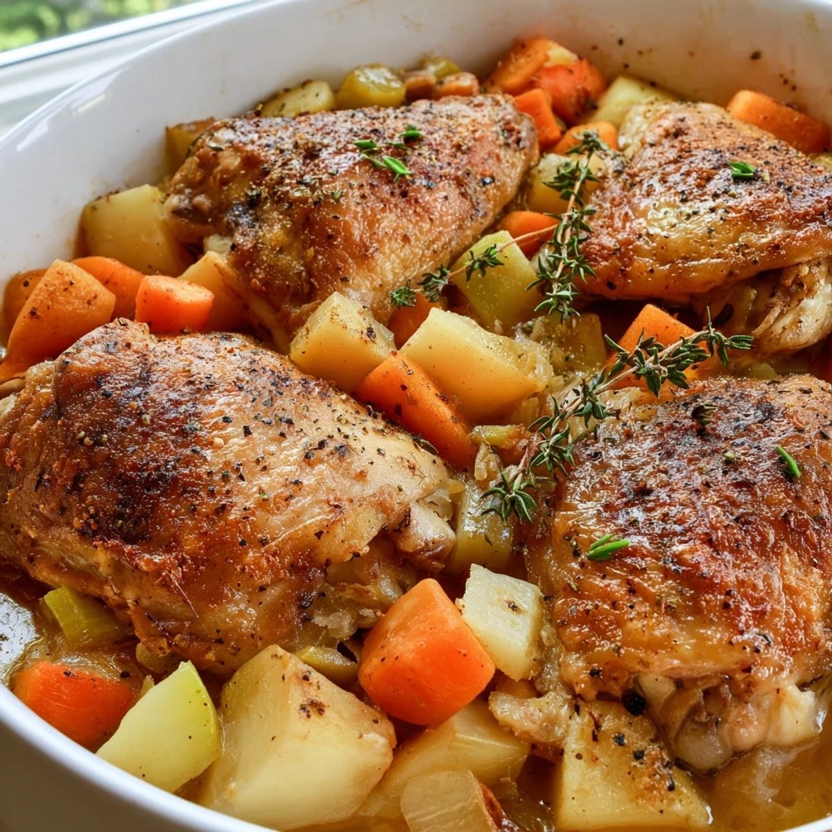 This comforting meal brings together tender chicken thighs, root vegetables, and aromatic herbs in a rich broth. After just 15 minutes of preparation, let your slow cooker do the work while flavors meld beautifully over six hours. The result is fall-apart chicken infused with thyme, rosemary, and paprika, surrounded by perfectly cooked carrots, potatoes, and onions. The natural juices create a savory sauce that pairs wonderfully with crusty bread or rice.